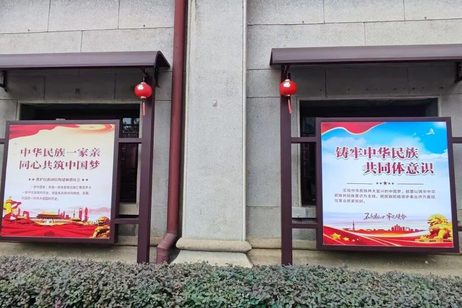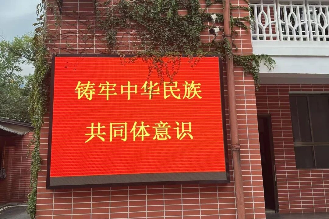 教堂侧坪电子屏全天滚动播放民族团结标语,门口宣传栏、会议室横幅图文并茂传递团结理念。